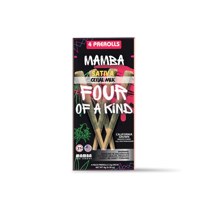 MAMBA Four Of A Kind (4 Prerolls - 8G) — This pack features four premium prerolls totaling 8 grams, crafted for a smooth, flavorful, and slow-burning smoke. Potent and long-lasting, Four Of A Kind delivers a powerful experience perfect for sharing or enjoying over multiple sessions.